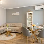 Gäste, die in der Ferienwohnung Happy Lazur übernachten, haben Zugang zu einem Balkon und einer Sitzecke, die mit einem Sofa und Annehmlichkeiten wie einer Klimaanlage ausgestattet sind. Die Medienausstattung im Zimmer umfasst ein Flachbildfernseher mit Satellitenkanälen. Das Apartment zählt 2 Schlafzimmer. Es gibt 1 Badezimmer mit einer behindertengerechten Dusche, einer getrennten Toilette und einer Badewanne sowie einem Haartrockner und Morgenmänteln.
